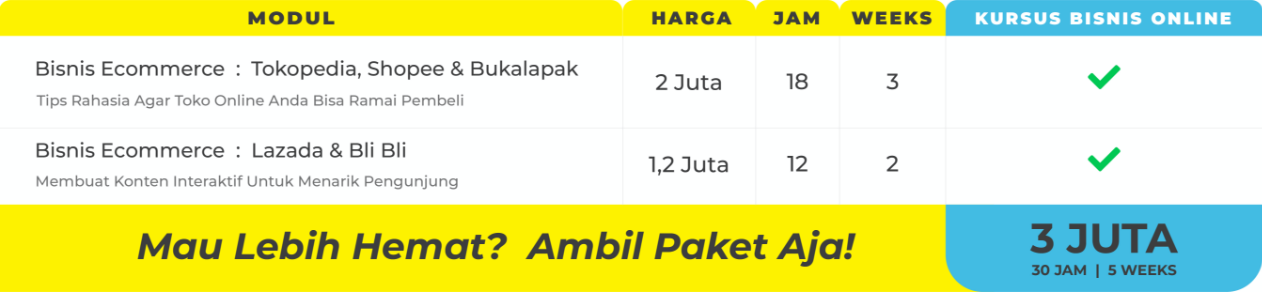 Dengan mengikuti KURSUS BISNIS ONLINE ini, kamu akan belajar cara membuat akun di toko online seperti Shopee, Tokopedia Bukalapak dan lain-lain. Selain itu, kamu juga akan belajar cara optimasi akun toko online tersebut agar bisa mendapatkan penjualan yang banyak.