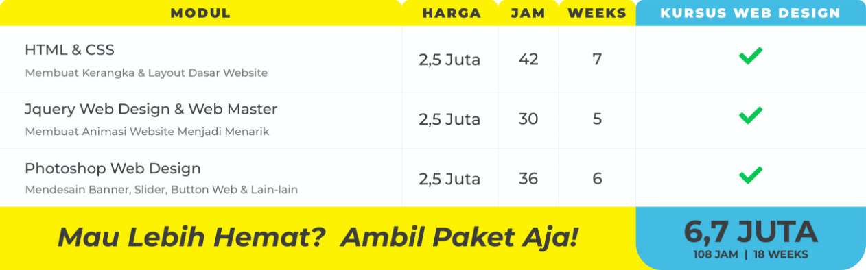 Untuk web design setidaknya peserta membutuhkan minimal 1-2 bulan untuk menguasai materi yang ada, dimana untuk desain ini sendiri perlu adanya keterampilan dan ketelitian. Untuk mnguasai dasar html dan css setidanya di perlukan 4-6 pertemuan dalam metode pembelajaran dengan latihan poraktek yang di berikan.